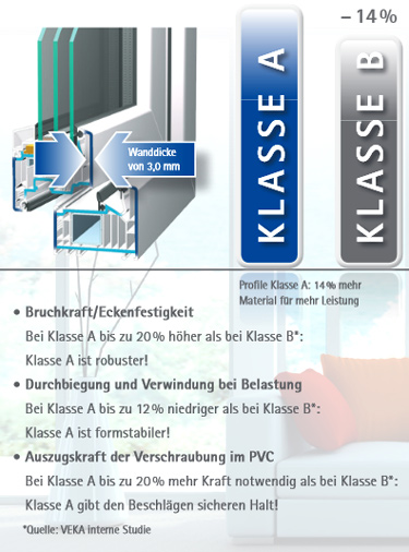 Für die Herstellung unserer Fenster verwenden wir ausschließlich VEKA-Fensterprofile der höchsten Qualitätsstufe Klasse A nach DIN EN 12608. Mit ihren ausgezeichneten Materialeigenschaften und der garantierten Außenwanddicke von 3,0 mm (Toleranz ± 0,2 mm) ermöglichen VEKA Profilsysteme besonders leistungsstarke Fenster, die jahrzehntelang zuverlässig funktionieren.